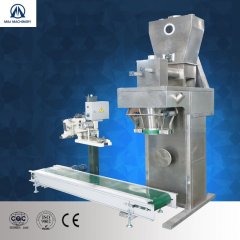 硫酸铵包装秤专为饲料,化肥,胶粉,PE粉等流动性较差的粉类物料的定量包装而设计,采用绞龙式给料,物料通过气动蝶阀进入缓冲料仓,物料通过变频控制的给料螺旋送到袋内。通过控制螺旋的转速控制给料量,料袋一旦到称装满,其夹袋器通过控制系统打开,料袋通过输送带送走,由人工扶助封口。