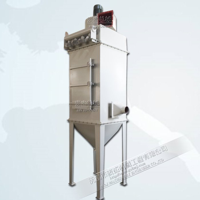 含尘空气经进风口切向进入中箱体,部分重质粉尘被首先离心分离落入下箱体,由刮板送至关风机排出,其余粉尘随气流流向滤袋,空气穿过滤袋进入袋内,通过上箱体经出风口排出,粉尘则被挡在滤袋外面,不能随气流排出,达到了气尘分离的目的。